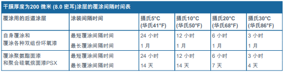 -最大覆涂間隔時間主要取決于表面的實際溫度 - 而不是簡單地只看大氣溫度。置于太陽直射暴曬或表面加熱的環(huán)境下, 涂層的最大覆涂間隔時間將會縮短。